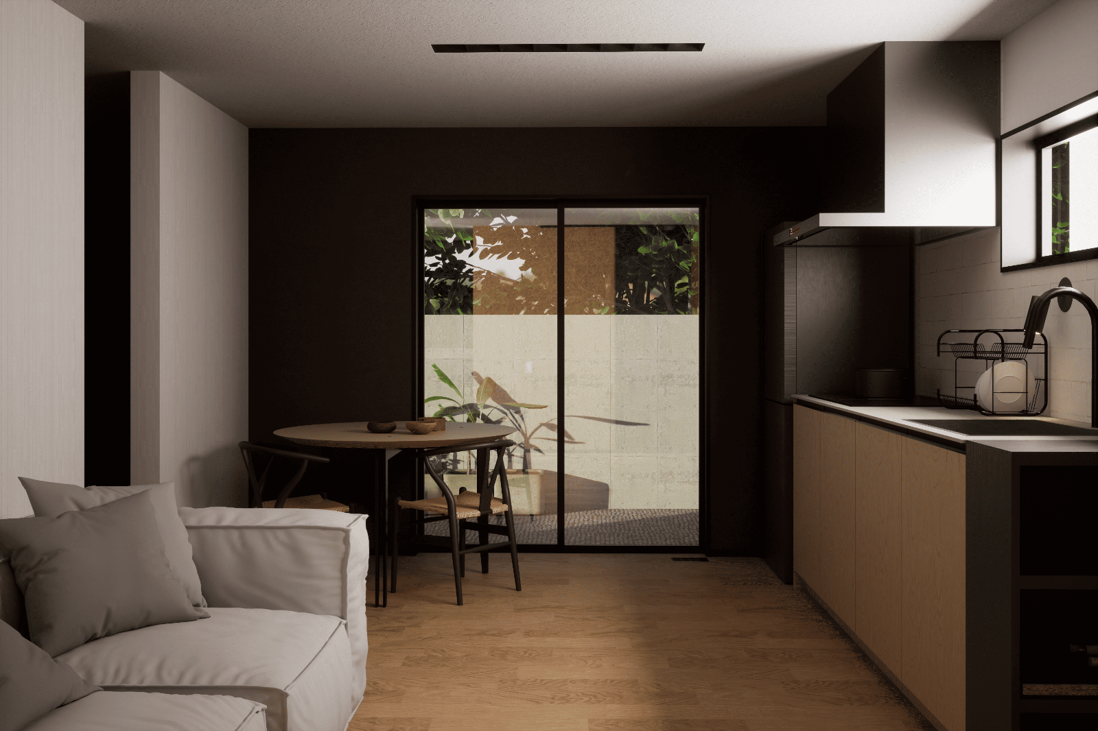 建物正面に設けられたアクセントウォールは、外観にインパクトある遊ぶ心を生み出しながらも、同時に玄関を隠しプライバシーを保護します。